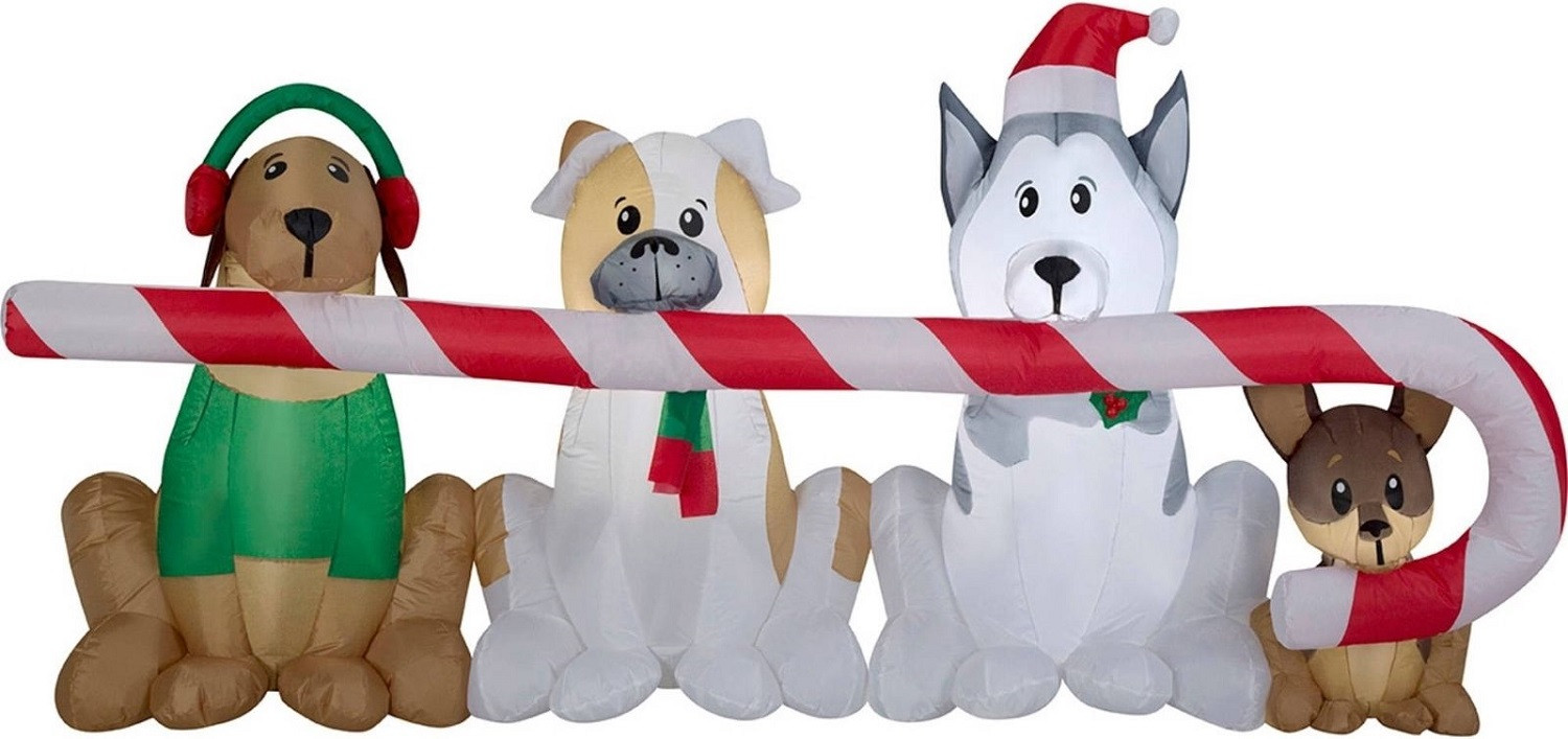 Greet your guests with this amazing inflatable scene. The puppies sharing a candy cane make an excellent addition to any holiday scene. Plug it in, stake it down and watch the magic of this air blown inflatable character unfold.