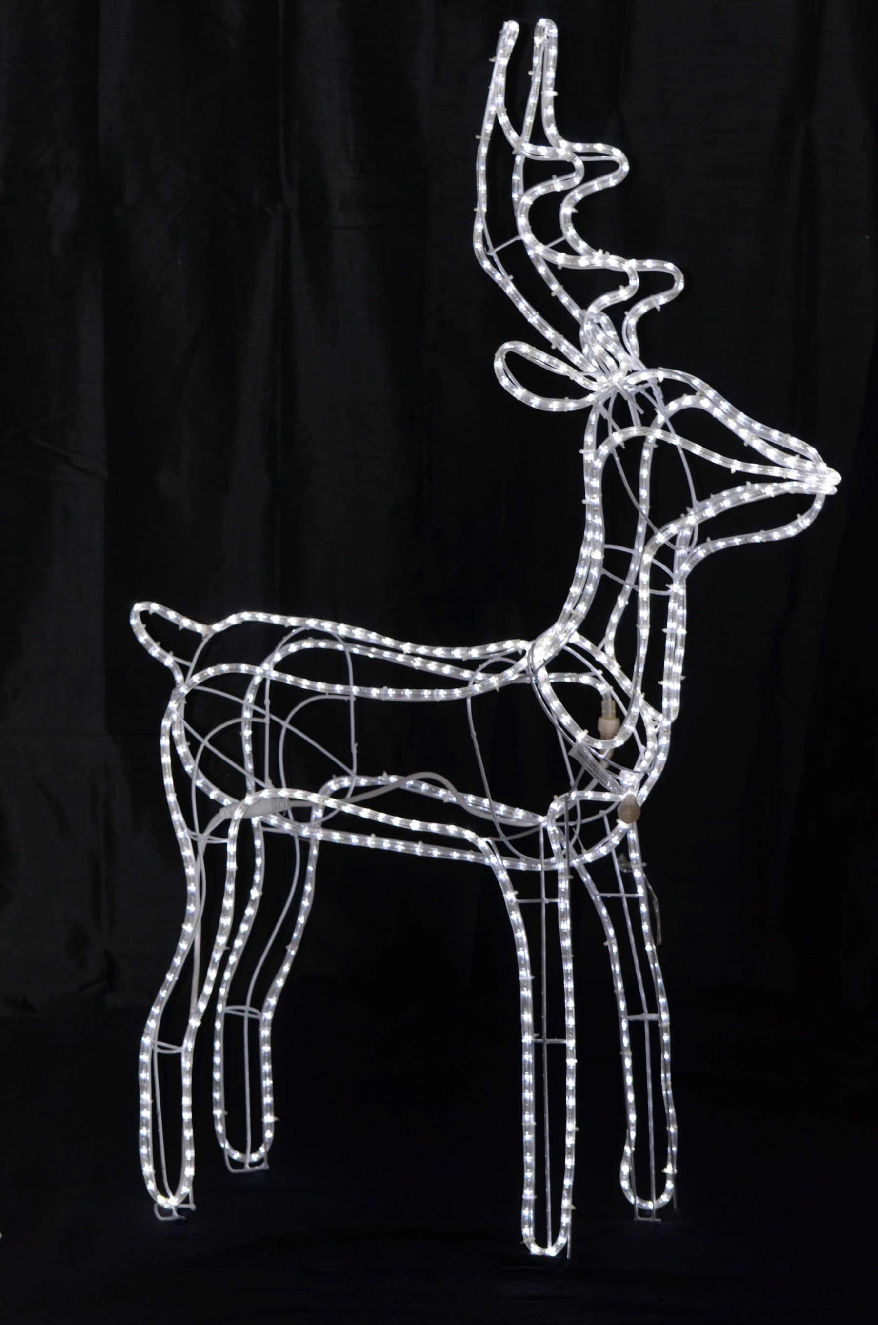 We put a new spin on an old classic with these elegant wire frame reindeer. The reindeer are wire frame with LED rope lights attached. The rope lights are bright white LED bulbs that give the reindeer a brilliant super bright glow.- Dimensions of Buck 62" H x 42" L x 12" W
