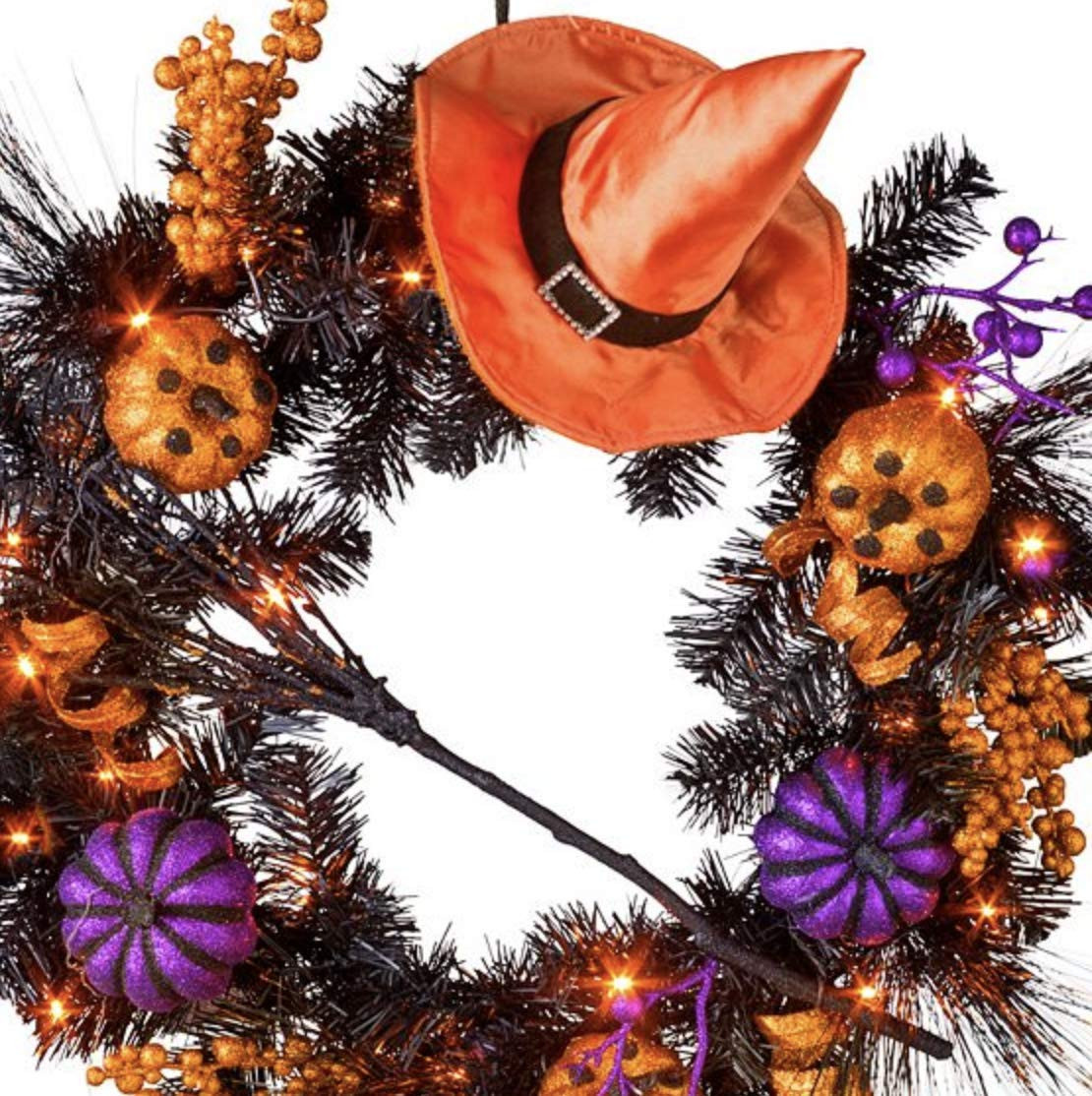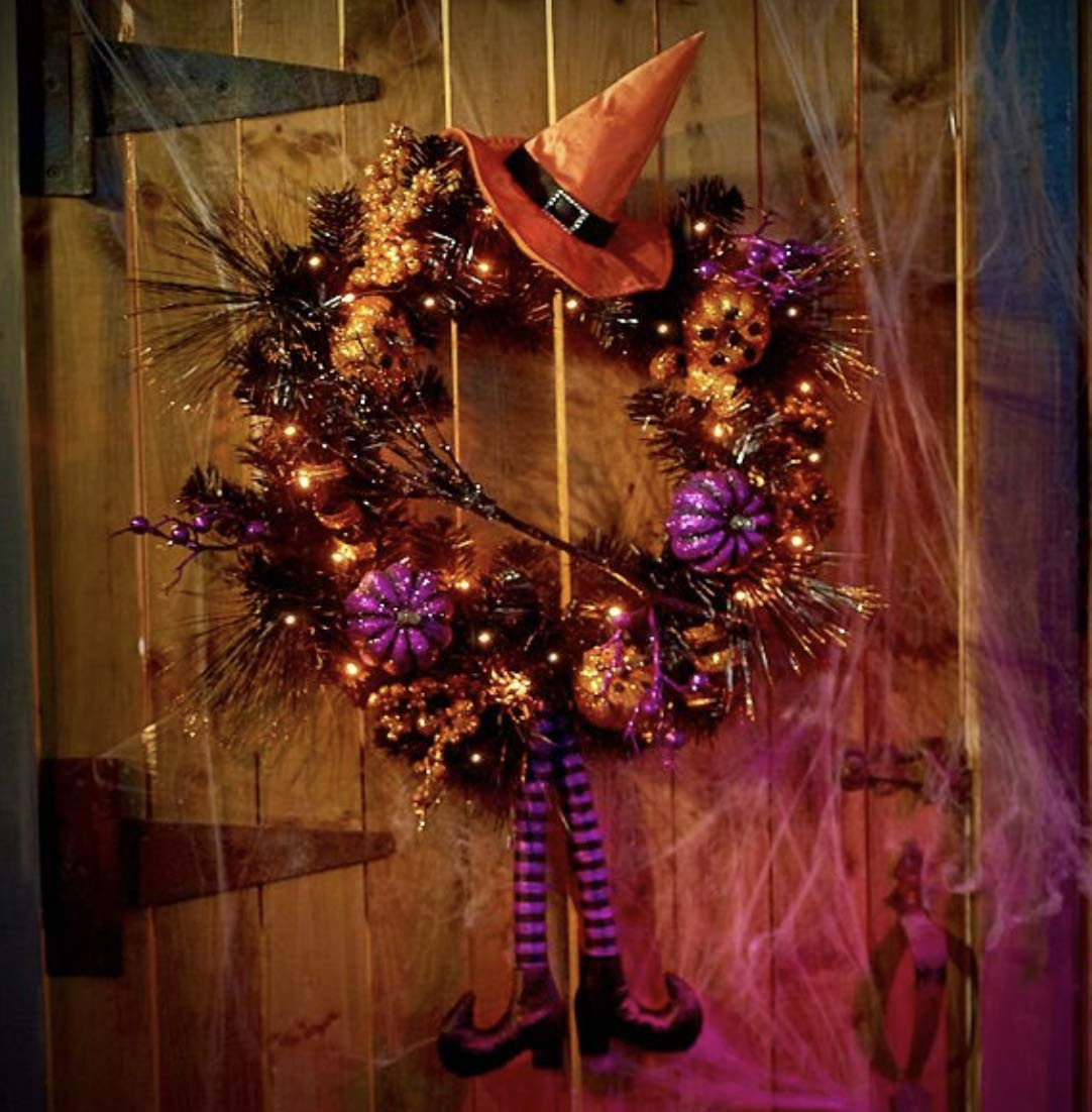 - Lighted Halloween witch wreath features glitter accents and 20 orange LED lights.