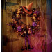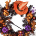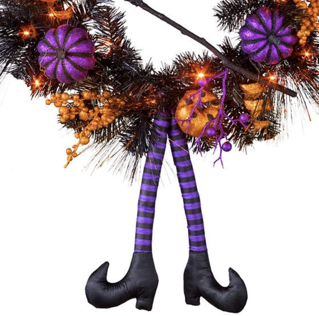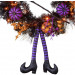 - Witchy wreath holds faux berries and pumpkins, ribbons, shoes, and a broom.