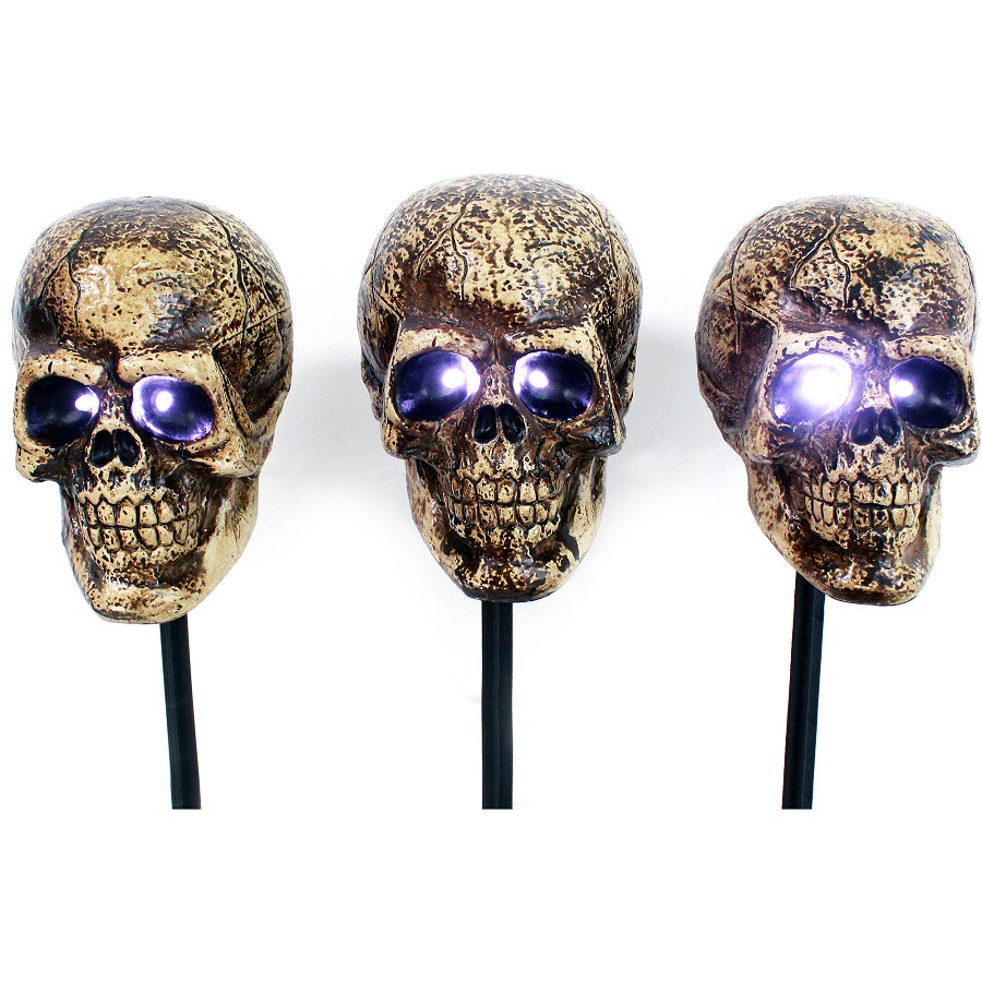 The Halloween Skull Path Markers will give your home the spooky illumination you want for the holiday with a fun design that is made to last. They allow you to line them up in a group with ease. The 3-pack of Halloween skull markers has a unique style that is sure to draw attention when trick-or-treaters stop by.