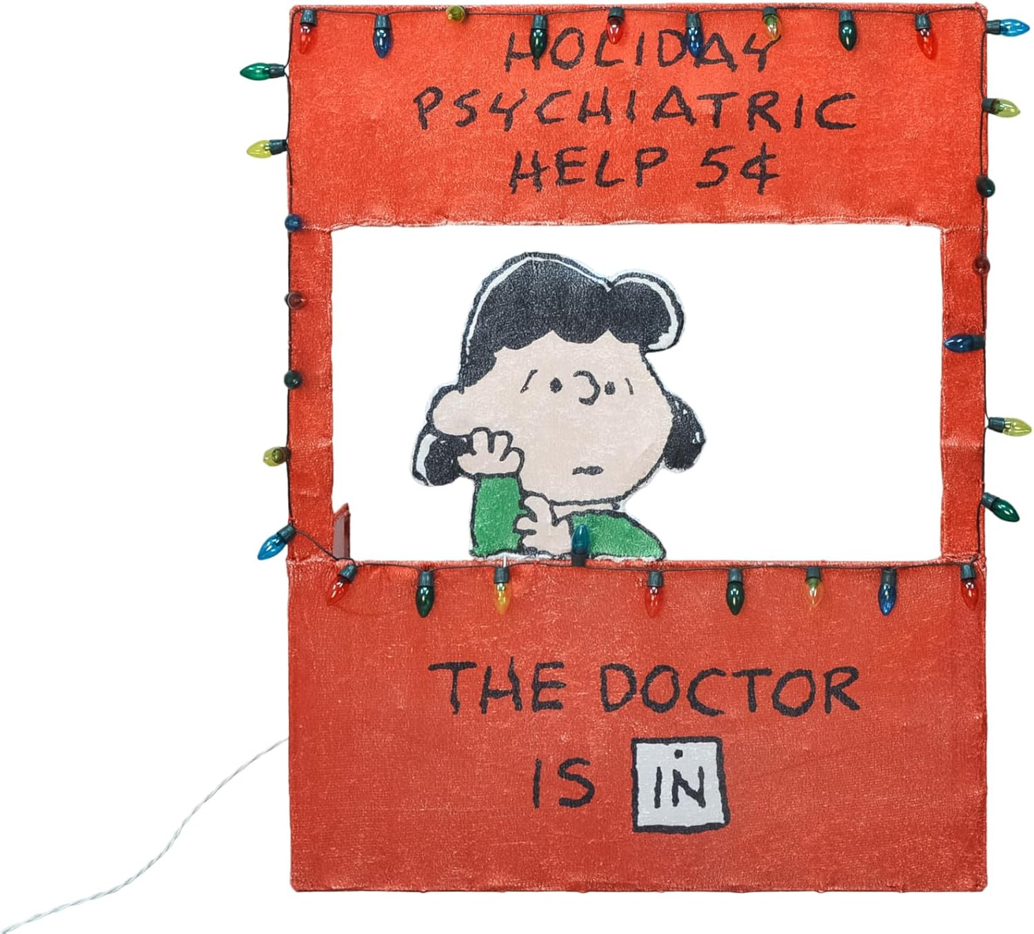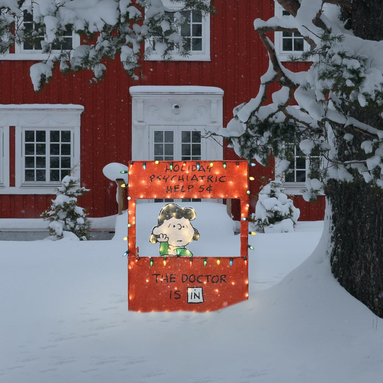 What's says Peanuts more then the iconic Psyche booth of Lucy. This Holiday decorated Christmas décor is lit with 100 LED lights and comes draped with old fashioned C9 lights. Fun and cheerful for all the neighborhood to see. This colorful decor can be enjoyed day or night. Lucy might even get some visitors during the holidays. pair with a Charlie Brown. It is a large impactful piece at 42 inches tall and 33 inches wide but it stores away small because it is made in 2 dimensional fashion. Sturdy construction with metal steel coated frame and covered in weather resistant fabric.